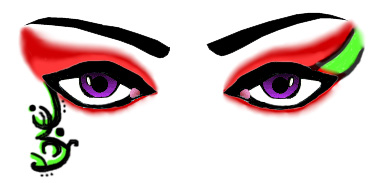 1. Anemic Random black characters above and below outside corners of eye, signs of some sort. Add pink liner below eye, trail downward below inside corners a bit. Blue stars with fading tips on both outside corners of eye. 2. Daisycutter Starts out with a peach-like shade of pink lining entire eye, trails at a slant at both corners, one above and one below. Dark pink above the peach shade above eye. Cream-yellow below peach shade underneath eye. Two quick swipes below one of them adds accent. 3. Space Between Line bottom of eyes with black. Smear a bit with an opposing downward motion about 3/4ths to the outside of the eye. Periwinkle blue filled in circles on both corners of eyes. Three dots lined up with the smear and above the eye. Left: Small grayish purple star next to outside corner. Slightly larger star of the same color above. Add light pink centers to both. Right: Small grayish purple star below eye about 1/4th inward. Outline of huge star around entire eye. Pink accents at where the corners go in on the outline and at the tips of the star. 4. Hero One eye outlined with bright orangeish red color; opposing lined with soft pink. Random stars, some outlines, some filled, of bright orange-red and soft pink and yellow orangeÊ surrounding eye. 5. Abhorration Swirls of dark red and bright green and dusty gold around eyes, one's colors a step brighter [more green than red]. Sort of a royal feel to it; no need to be symmetrical.